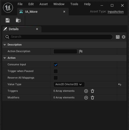 The most important thing to change here is the Value Type. This determines what this action actually does. While a jump action is just a simple bool, a move action can be a 2d axis.