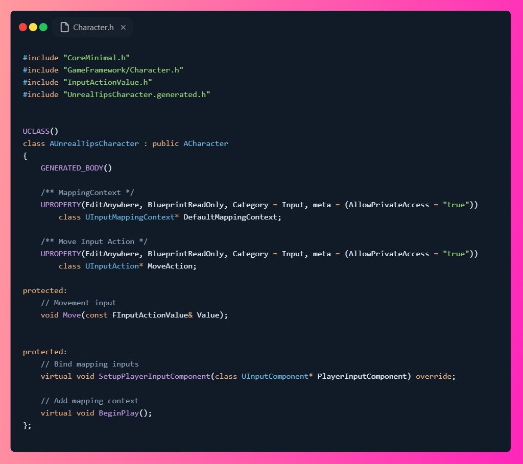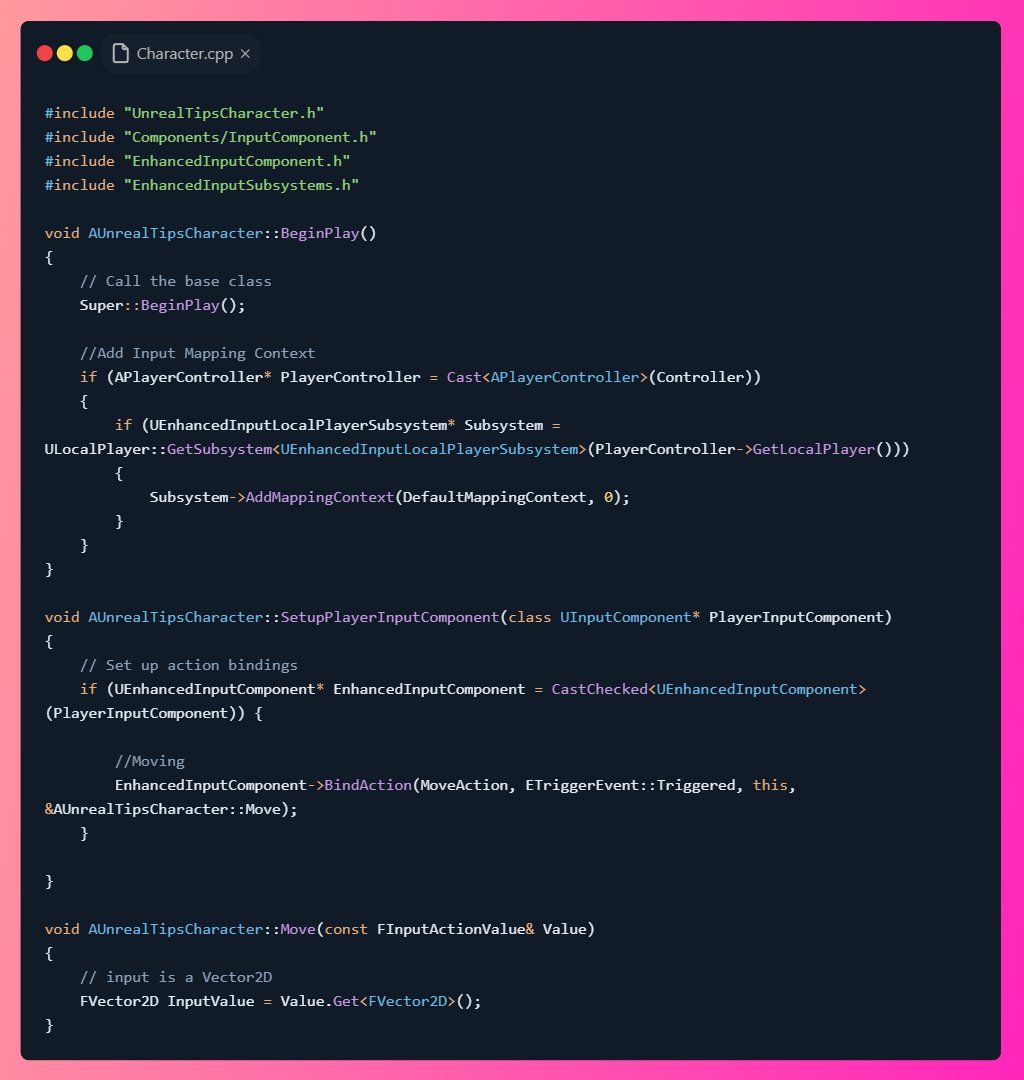 <aside> <img src="https://pbs.twimg.com/profile_images/1469386518624190465/Y2esUYsl_400x400.jpg" alt="https://pbs.twimg.com/profile_images/1469386518624190465/Y2esUYsl_400x400.jpg" width="40px" /> Robin Vanina 💡 #UnrealTips @RobinVanina: Pretty much the same for C++ First we have to add the Mapping Context on beginPlay.